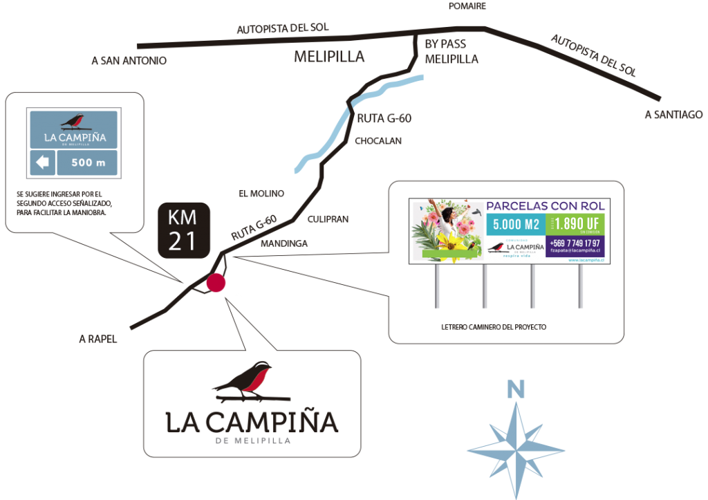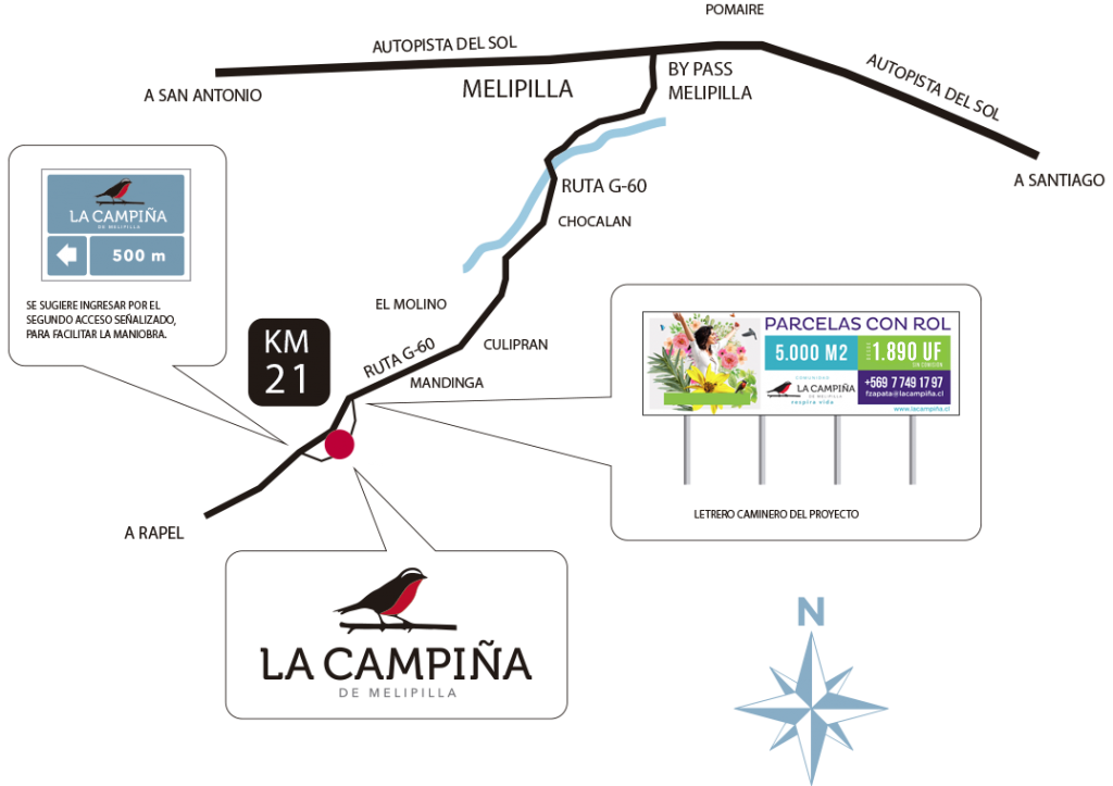 La Campiña tiene muy fácil acceso y se encuentra ubicada a 21 km. de Melipilla, en la zona Los Maitenes, perteneciente a la Región Metropolitana, en dirección al lago Rapel. Inmediatamente al costado izquierdo de la carretera de la fruta o Ruta G-60 y muy cerca de distintos atractivos turísticos y diversas zonas de interés.